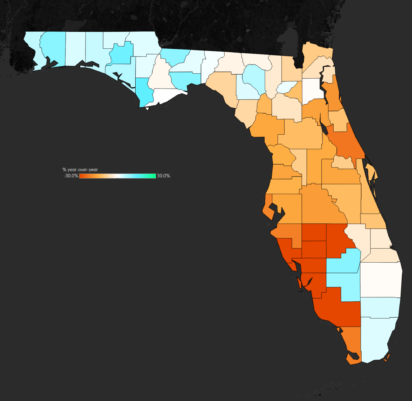 With the hurricane making landfall on Sept. 28, we saw a dramatic decline in economic activity as Ian charged across the state and residents hunkered down. Between Sept. 28 and Oct. 4, total retail sales were down 30% in the impacted counties.